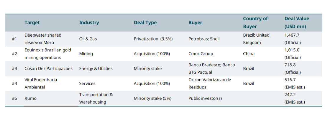 Home>News & Insights>Insights>December 2025 TOP M&A deals in Brazil marketDecember 2025 TOP M&A deals in Brazil market EMIS Insights EMIS 30.01.2026 under a minute read Brazilian oil giant Petrobras, in consortium with Shell, is acquiring a 3.5% stake in the Mero shared reservoir from the Federal Government of Brazil for BRL 7.7bn (USD 1.5bn). The stake was secured through the Non-Contracted Areas Auction. The consortium structure gives Petrobras 80% and Shell 20% participation. The deal aligns with Petrobras’ strategy to reinforce its reserve base in high-productivity pre-salt assets, with Mero being a key long-term growth contributor. Tags BrazilRecent Posts ISI Unveils Refreshed Brand and Unified Global Proprietary Data Platform ISI 12.03.2026 Press Releases London, 12 March, 2026: ISI Markets is reintroducing itself as ISI – uniting its broad array of proprietary data assets under a Read More Energy shock may renew inflationary pressures and stress gas grids in Europe CEIC 11.03.2026 Publications Last year, inflationary pressures looked under control in Europe. As war erupts in the Persian Gulf, that could be set to change -- highlighting the continent's energy dependence on oil tankers and LNG vessels. Read More A lingering reliance on Gulf energy amid India’s renewables push CEIC 11.03.2026 Publications India is one of the many Asian nations whose energy supplies are at risk from the current crisis. About half of the nation's fossil-fuel imports transit the Strait of Hormuz in tankers departing Saudi oil terminals and Qatari LNG facilities. We've highlighted the affected sources of supply. Read More Sorry, no articles match the current filters. Sorry, no articles match the current search query.