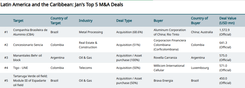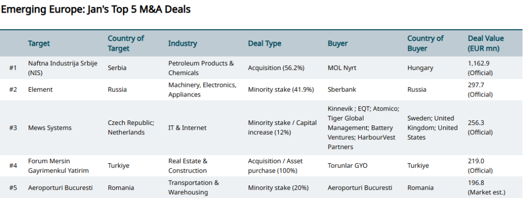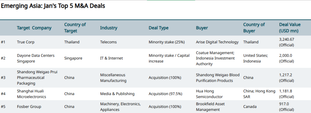 Home>News & Insights>Insights>February 2026 Top M&A Deals in Emerging Markets by RegionFebruary 2026 Top M&A Deals in Emerging Markets by Region EMIS Insights EMIS 18.03.2026 1 min read Eastern Europe Hungarian energy group MOL has signed a binding heads of agreement to acquire a 56.15% stake in Serbian oil company Naftna Industrija Srbije (NIS) from Russia’s Gazprom for between EUR 900mn and EUR 1bn, according to Serbia’s president. The deal remains subject to approval by the U.S. Office of Foreign Assets Control (OFAC) due to sanctions on NIS. MOL is also in talks with ADNOC to join as a minority investor. The acquisition would strengthen MOL’s regional footprint, adding significant reserves and nearly 400 retail stations across Southeast Europe. Latin America and the Caribbean China’s Chalco and global miner Rio Tinto have agreed to acquire Votorantim’s 68.596% stake in Brazilian aluminium producer CBA for BRL 4.6bn (USD 902.7mn), valuing the deal at USD 1.57bn including net debt. The buyers will pay in cash via a newly formed JV (Chalco 67%, Rio 33%). The JV must launch a mandatory tender offer for the remaining shares and may pursue a delisting. The acquisition supports Chalco’s global expansion, leveraging CBA’s low-cost renewable energy base and Rio Tinto’s operational expertise to strengthen supply chains and ESG positioning. Emerging AsiaNorway’s Telenor has agreed to sell its 24.95% stake in Thai telecom operator True Corp to Arise Digital Technology Co Ltd, owned by Thai businessman Suphachai Chearavanont, for USD 3.2bn. The divestment allows Telenor to sharpen its focus on core markets, improve capital efficiency, and enhance shareholder returns. True Corp is a leading Thai telecom provider, generating USD 5.8bn in net sales revenue in 2024. Tags Emerging MarketsM&A & InvestmentTop DealsRecent Posts Norway’s Telenor Seals USD 3.9bn Exit from Thailand as Suphachai’s Arise Takes the Helm at True EMIS 18.03.2026 Insights Norwegian telco Telenor has agreed to sell its stake in True Corporation Pcl, Thailand’s largest telecom-tech platform, in a landmark transaction valued Read More Indonesia's new capital: mapping a development boom CEIC 17.03.2026 Publications Indonesia is building a new capital on Borneo's east coast. The construction of Nusantara aims to spearhead development in the archipelago nation's less developed Kalimantan provinces and relocate the administrative apparatus from the congested megacity of Jakarta. T Read More China's inflation uptick as "Two Sessions" favors consumer-driven growth CEIC 17.03.2026 Publications China recently concluded its "Two Sessions" meetings, a key forum for policy-setting. Similarly to last year, domestic-driven demand and consumption Read More Sorry, no articles match the current filters. Sorry, no articles match the current search query.
