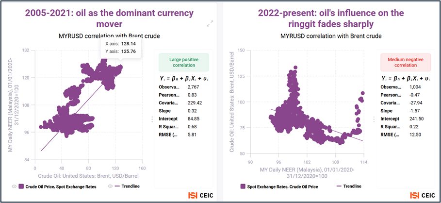 “As an oil producer, it’s notable that Malaysia’s ringgit (MYR) (and, to a lesser extent, Indonesia’s rupiah) depreciated somewhat less than the heavily [oil] import-dependent Philippines peso and Thai baht,” they wrote in a recent report. “The ringgit’s relationship with oil has become less important post-Covid, as our correlation charts show. The MYR seems less likely to return to a “petro-currency,” with its performance instead likely governed by the country’s ability to navigate broader economic uncertainties.”