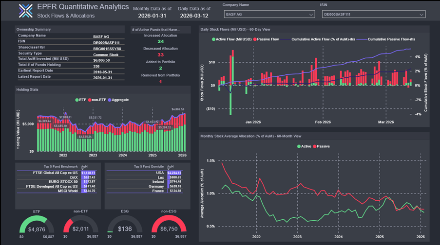 EPFR Stock Flows & Allocations data for the largest chemical producer in the world, BASF, shows active managers heavily underweight the stock prior to 2025. But in mid-2024, active managers started allocating more to the stock and are now benchmark weight, or slightly overweight as of the latest month. Passive and active investors have been committing relatively consistently to the German chemical giant year-to-date, with inflows up above 5% and 2% of the stock’s assets, respectively.