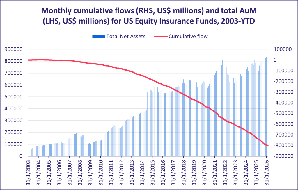 Among the US-mandated groups experiencing redemptions were US Equity Insurance Funds which invest in variable annuities and are key parts of many US retirement portfolios. In recent years, rising markets have boosted the group’s total AUM while the growing number of ‘baby boomers’ retiring has seen cumulative redemptions gather momentum.