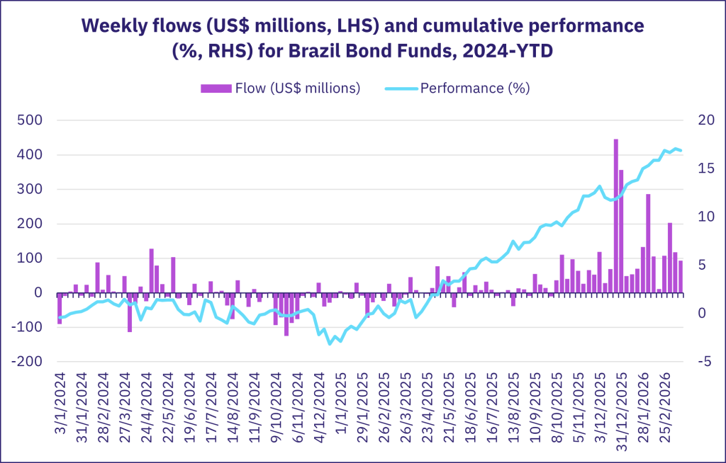 In the case of Emerging Markets Bond Funds, it was the diversified Global Emerging Markets (GEM) Bond Funds that again experienced the heaviest redemptions, with this week’s total being the largest since early 2Q25. At the country level, Brazil Bond Funds swam against the broader tide by posting their 24th straight inflow as investors responded to the near 14% yields on the country’s 10-year sovereign debt.