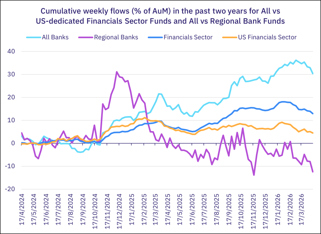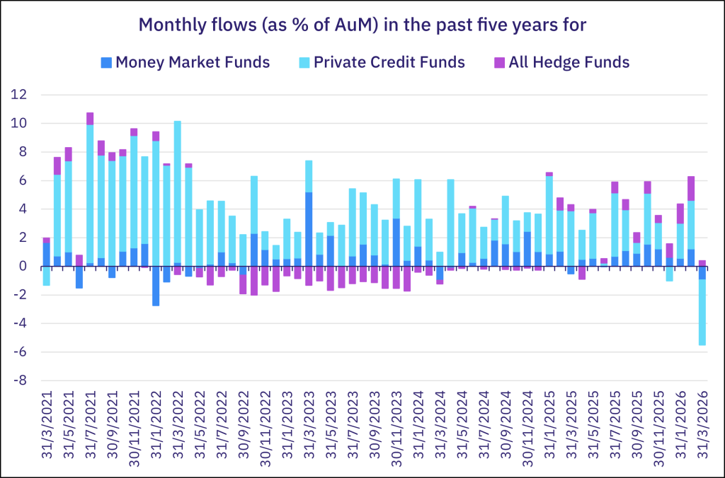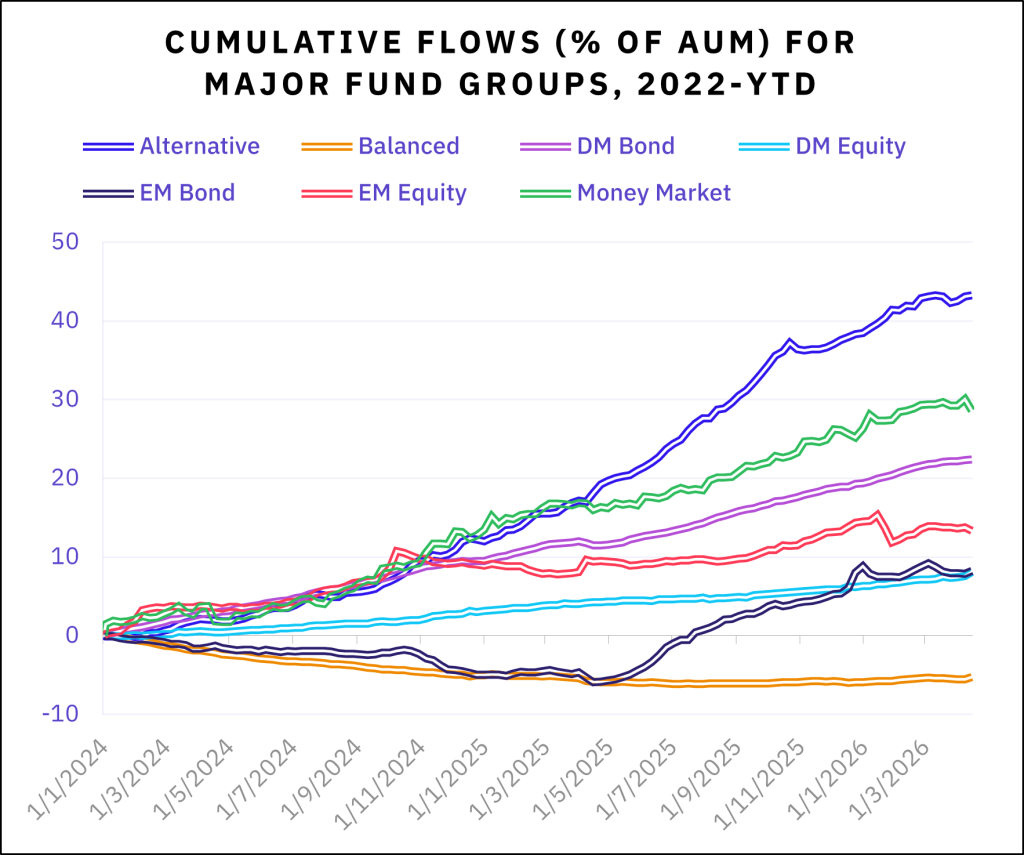 Home>News & Insights>Insights>Some optimism eludes the blockade in mid-AprilSome optimism eludes the blockade in mid-April EPFR Insights EPFR 24.04.2026 9 min read The market euphoria that followed the announcement of a ceasefire between the US and Iran on April 7 soon ran into the painful reality that both sides remain far apart. But, despite the US blockade of the Straits of Hormuz, its momentum lifted benchmark US equity indexes to fresh record high and continued to drive a “risk on” rotation in the flows to and from EPFR-tracked fund groups. Going into the second half of April, investors pulled over $8 billion from Europe and Japan Equity Funds while US Equity Funds posted their third straight inflow and fifth since the fighting began. Emerging Markets Bond Funds snapped their five-week redemption streak, High Yield Bond Funds chalked up their biggest weekly inflow since mid-2Q25, and Private Credit Funds recorded another modest inflow. Investor appetite for income-producing assets remains strong. Dividend Equity Funds ended the week with their 91st inflow over the past 24 months and all Bond Funds extended an inflow streak stretching back to the fourth week of 2Q25. Overall, the week ending April 15 saw a net $7.8 billion flow into all EPFR-tracked Bond Funds and $11.3 billion into Equity Funds. Investors also steered $1.8 billion into Balanced Funds and $3.2 billion into Alternative Funds while outflows from Money Market Funds exceeded $170 billion. In the case of the liquidity funds, the key driver was the deadline for quarterly and 2025 US income tax payments. At the asset class and single country fund levels, flows into Bear Funds and redemptions from Leveraged Equity Funds hit their highest levels since late 2Q25 and mid-2Q25, respectively, Inflation Protected Bond Funds absorbed fresh money for the 11th straight week, and Space and Satellite Funds recorded their biggest inflow since early March. Russia Bond Funds set a new inflow record for the third week running, flows into Turkey Money Market Funds climbed to a fresh record high and Netherlands Bond Funds experienced record-setting redemptions. Emerging Markets Equity Funds The second week of April saw all Emerging Markets Equity Funds post their biggest collective outflow as Asia ex-Japan Equity Funds saw over $14 billion redeemed. Those redemptions offset fair-to-strong inflows for EMEA, Frontier, the diversified Global Emerging Markets (GEM) and Latin America Equity Funds, with the latter setting a new weekly record. It was a tough week for Leveraged EM Equity Funds, which posted their biggest outflow since EPFR started tracking them, and EM Dividend Funds saw a five-week run of inflows end. But funds with socially responsible (SRI) or environmental, social and governance (ESG) mandates tallied their 11th inflow over the past three months and flows into EM Collective Investment Trusts (CITs) hit a 12-week high. An inflow of over $1 billion to Brazil Equity Funds underpinned the headline number for all Latin America Equity Funds. Investors gravitated to fund groups offering exposure to markets with energy stories, with Argentina Equity Funds posting their third highest inflow of the year-to-date, flows into Colombia Equity Funds hitting a level last seen in mid-2Q23, and Mexico Equity Funds attracting over $100 million for the first time since mid-February. There was less interest in Chile’s copper story. In a recent note, CEIC economists noted that, “Export figures from Chile, the world’s no. 1 copper producer… suggests that a historic boom might be levelling off.” Driven by record prices, Chilean copper shipments hit their highest level since 2021 in January, but “Chile’s copper export growth rate has steadily retreated as the conflict persisted through March.” Among the Asia ex-Japan Country Fund groups, those with artificial intelligence stories saw investors pull back with Mainland China, Korea and Taiwan (Province of China) Equity Funds all experiencing redemptions. In the case of Mainland China Equity Funds, five of the 10 individual funds posting the biggest outflows were also on the same list for the week ending January 28 when the group experienced record redemptions. Lingering optimism about the chances of a negotiated settlement between the US and Iran saw Israel Equity Funds post their biggest outflow since late September while Turkey Equity Funds recorded their first inflow since mid-February and biggest since late January. Developed Markets Equity Funds That the US and Iran have been talking – if not agreeing – about the outlines of an end to their latest conflict was enough for investors during the second week of April. The US blockade of the Straits of Hormuz notwithstanding, they pumped another $17 billion into US Equity Funds while continuing to distance themselves from Europe and Japan-mandated funds. That enabled all EPFR-tracked Developed Markets Equity Funds to post their 12th inflow of the year so far. The renewed appetite for US exposure was also reflected in the latest flows to Global Equity Funds, the largest of the diversified groups. Funds with fully global mandates again took in $3 for every $1 committed to Global ex-US Equity Funds. Both domestically and foreign domiciled US Equity Funds enjoyed solid inflows during the latest week, with the bulk of the fresh money finding its way into Large Cap Mixed Funds. Despite the positive inflows, recent data suggests that investor and manager conviction is fragile. US Bear Funds posted their biggest collective inflow in over 28 months and selling by corporate insiders has accelerated. In a recent report, Senior Liquidity Analyst Winston Chua noted that, “Since the onset of the Iran war (Feb 28), insider activity has tilted decisively toward selling, with the sell-to-buy ratio rising to 9.4-to-1 from 6-to-1 between January 1 and February 27. While not an outright bearish signal, the elevated ratio points to increased caution a