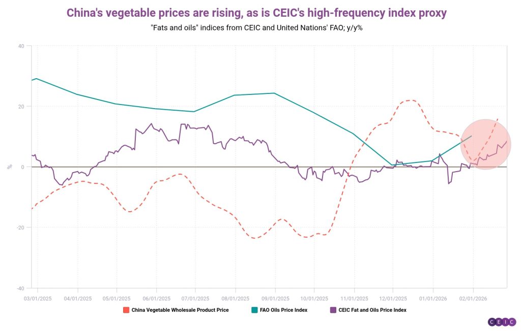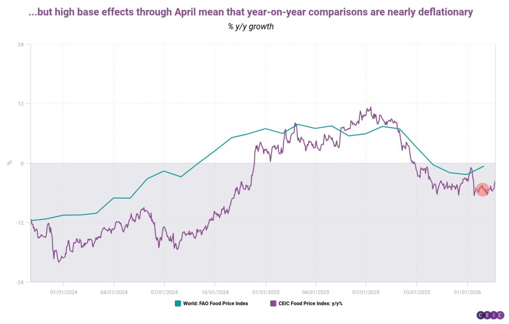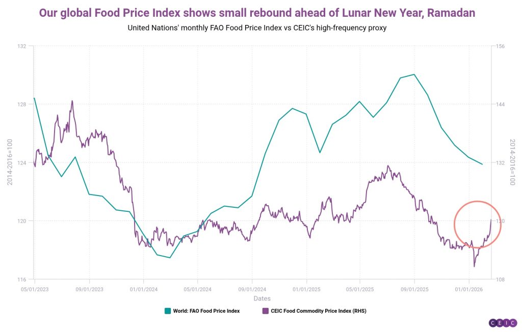 Our chart also shows a January lull and then rebound, likely linked to the global impact of Lunar New Year festival spending and upcoming Eid-ul-Fitr in March. (Ramadan tends to push prices higher due to supply disruptions and demand pressures for certain categories of food.)