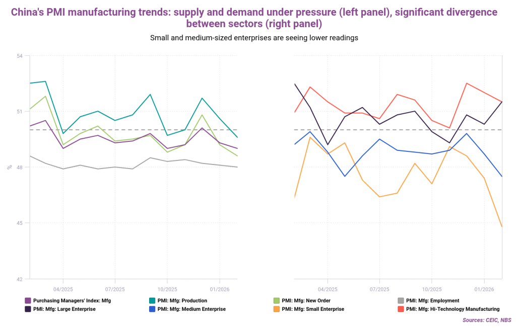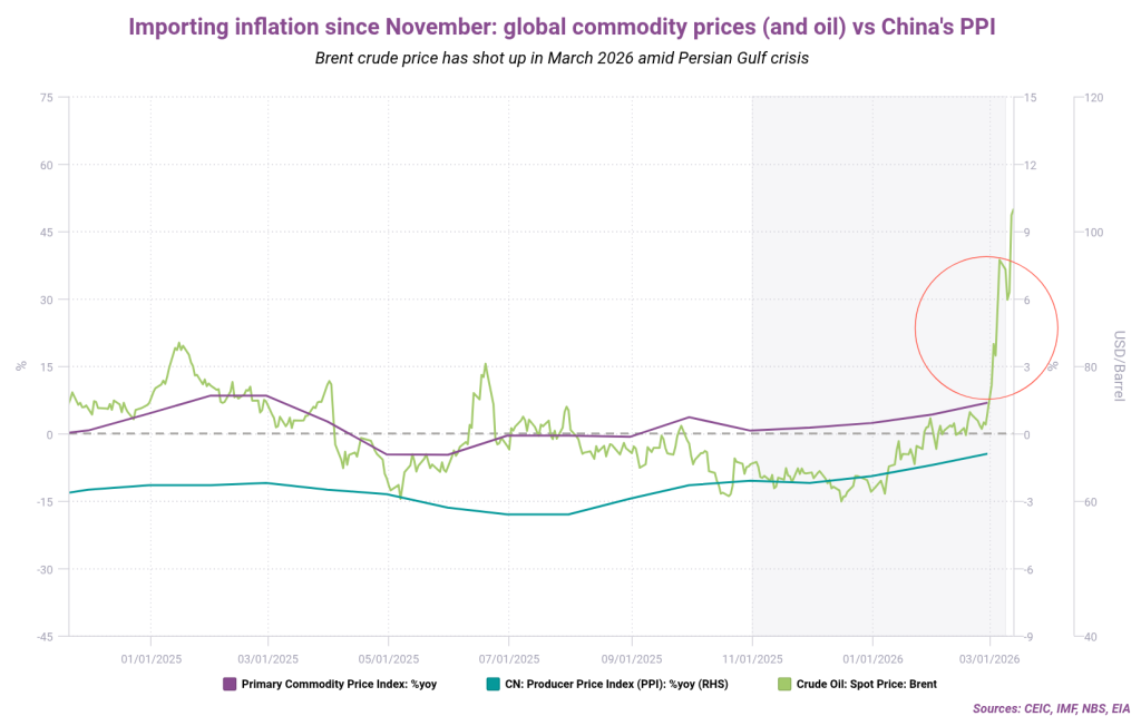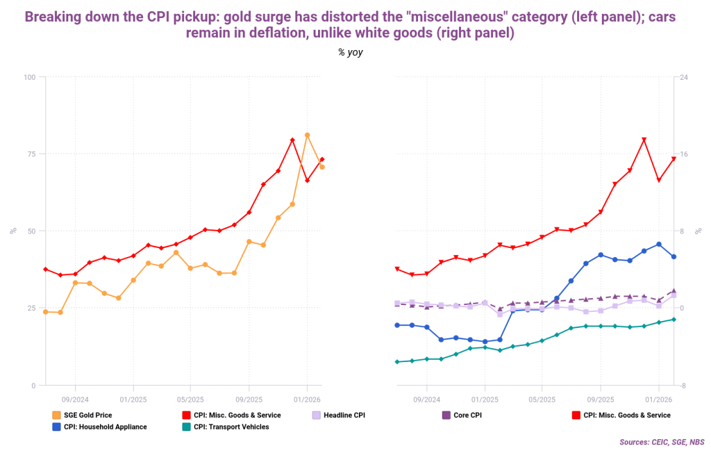 Home>News & Insights>Publications>China's inflation uptick as "Two Sessions" favors consumer-driven growthChina’s inflation uptick as “Two Sessions” favors consumer-driven growth CEIC Publications CEIC 17.03.2026 1 min read China recently concluded its “Two Sessions” meetings, a key forum for policy-setting. Similarly to last year, domestic-driven demand and consumption are being targeted. In this context, we’re exploring our newly introduced inflation nowcast for China to get an early sense of how this demand-driven policy thrust has been rippling through the economy. February consumer prices ticked higher to a 1.3% annualized rate, according to the most recent reported figure. Our nowcast suggests this trend has been sustained in early March. This tracks with our previous story on the economically important Spring Festival, which showed how Chinese consumers were favoring domestic travel and tourism. Flight traffic hit a multi-year high, for instance. This surging demand fed through to prices, causing the CPI sub-indices for tourism and airfares to spike. Of course, external factors also feed into Chinese inflation. An analysis of prices paid by Chinese factories (i.e., PPI) shows how they have been correlated with a pickup in global commodity prices since late last year. (Amid the crisis in the Persian Gulf, we’ve added the Brent crude oil price surge to our chart; this is sure to be reflected when March PPI and commodity index figures are released.) Chinese CPI is also dragged higher by the surge in gold prices, which feeds through to the “miscellaneous” category (which includes jewelry). Looking at manufactured goods inflation reveals a divergence: home appliance prices are rising, driven by the national “trade-in” policy to support demand and rising upstream costs from those commodity inputs. Meanwhile, manufacturing PMI sub-indices continue to indicate a weakness in supply and demand. Neither production nor new orders have returned to the expansionary zone (i.e. readings over 50). Overall business sentiment remains under pressure. High-tech manufacturing and large enterprises are maintaining some resilience, while SMEs are facing headwinds. In total, our charts suggest that the current inflation uptick is not a generalized demand recovery, but rather an uneven phenomenon shaped by commodity imports, policy shifts and localized cost-push factors. If you are a CEIC user, access the story here. If you are not a CEIC client, explore how we can assist you in generating alpha by registering for a trial of our product: https://hubs.la/Q02f5lQh0 Tags ChinaChinaConsumerInflationRecent Posts Indonesia's new capital: mapping a development boom CEIC 17.03.2026 Publications Indonesia is building a new capital on Borneo's east coast. The construction of Nusantara aims to spearhead development in the archipelago nation's less developed Kalimantan provinces and relocate the administrative apparatus from the congested megacity of Jakarta. T Read More London's housing unaffordability persists despite rate relief and flat market CEIC 17.03.2026 Publications London property is getting cheaper, but that has resulted in limited relief for first-time homebuyers Read More ASEAN currencies have been resilient despite the oil spike CEIC 17.03.2026 Publications With many Asian countries dependent on oil imported from the Persian Gulf, we're examining how currencies in the ASEAN bloc have reacted to the current geopolitical crisis. Read More Sorry, no articles match the current filters. Sorry, no articles match the current search query.