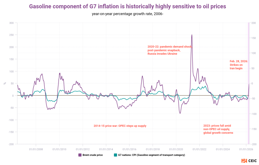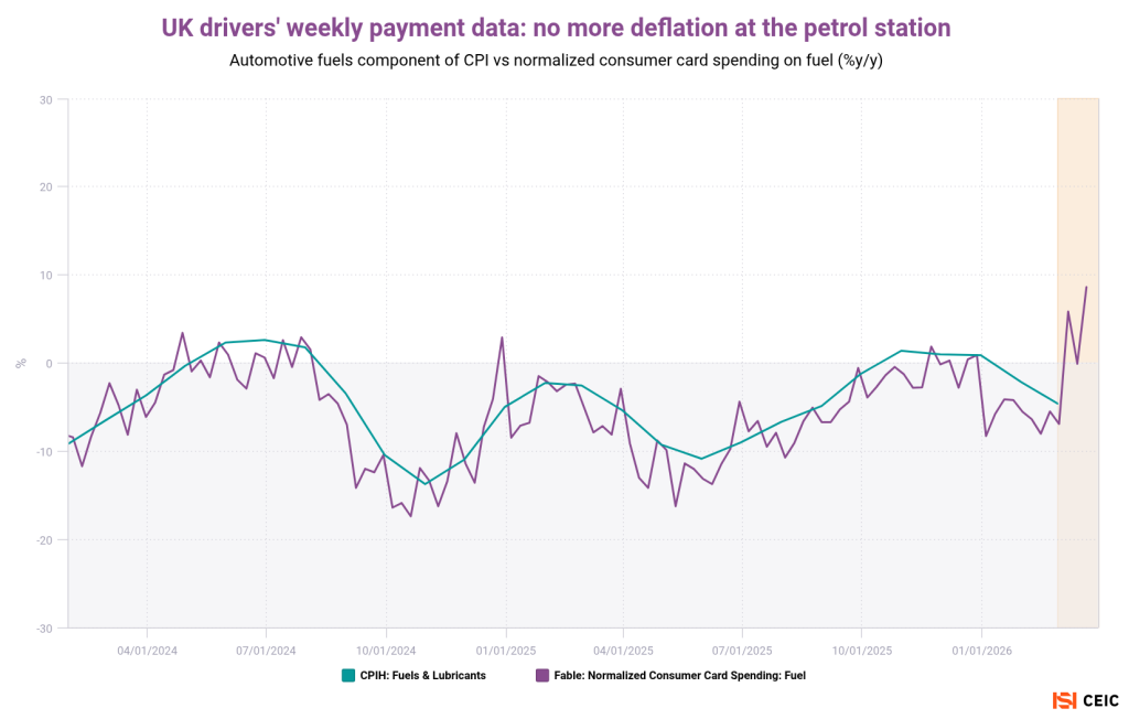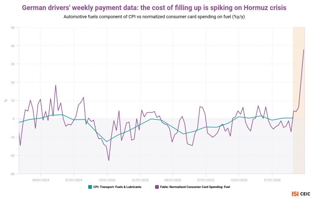 Home>News & Insights>Publications>Daily payment card data from the world's fuel stations point to war-driven uptick in the CPIDaily payment card data from the world’s fuel stations point to war-driven uptick in the CPI CEIC Publications CEIC 06.04.2026 2 min read By Ian Lim From the first Gulf War in 1990 to the current crisis in the Strait of Hormuz, the quickest impacts from geopolitical shocks often show up in gasoline prices and then feed into inflation. We can observe this phenomenon in near real time thanks to our daily and weekly payment-card data for major economies. Our first chart uses the US as an example. For most of 2024 and 2025, retail gasoline prices were falling year-on-year. At the time of publication, February was the last print for the US consumer price index and its transport segment; the gasoline sub-component was down 5.5% from a year earlier. To see what’s been happening in March, we can observe total daily card spending at US gas stations, as well as “volume-adjusted” card spend from Facteus. (Adjusting for volume helps isolate pump prices from consumer behavior, zeroing in on how much fuel drivers are using — rather than potentially confusing a price spike for higher demand.*) On a volume-adjusted basis, card spending on gasoline returned to inflationary territory as of mid-March, while the deflationary trend on total spending has almost gone into reverse. Given past correlations, expect fuel inflation prints in March to see a significant uptick. For a sense of the long-term correlation between oil prices and national inflation prints, our second chart compares the rates of change for Brent crude and gasoline CPI across the Group of 7 developed economies. Most of the G7 saw a mild-to-modest deflation in fuel prices supported by crude oil prices since mid-2023 — indeed, lower fuel prices helped keep a lid on overall inflation during that period. Returning to payment cards, we tapped alternative weekly datasets from Fable to visualize spending at the pump in Germany and the UK. (Given the more prominent role of diesel in Europe, both the card and CPI datasets account for all automotive fuels, not just gasoline.) While 2024-25 trends were similar, it’s notable that on an annualized basis, German drivers appear to be spending sharply more on fuel than their British counterparts in the most recent data. Our final chart addresses Turkey and taps weekly card data from the central bank. Like our US chart, the service-station spending can also be volume-adjusted. Relative to recent trends, Turkey is notable for a limited uptick in fuel spending — with consumers somewhat cushioned by the nation’s “sliding scale” system whereby the government gives up tax revenue to smooth prices. Turkey also potentially benefits from its pipeline from Iraq, which is currently unable to export oil via the Strait of Hormuz. *To be sure, as a necessity more than a luxury in the US, gasoline spending at the pump tends to be relatively inelastic in the short term — i.e.: cheaper fuel prices do not significantly increase consumption volume, and vice versa. Tags EuropeInflationOilUnited StatesRecent Posts Merz defense push hasn't revived German manufacturing CEIC 06.04.2026 Publications When Chancellor Friedrich Merz announced a dramatic increase in defense spending a year ago, many observers hoped that this would stimulate Germany’s stagnant industrial production. Read More China-Mexico relationship reflects increasingly entwined manufacturing CEIC 06.04.2026 Publications As Mexico starts talks with Donald Trump's administration to review the USMCA trade agreement, economic ties with China are in focus. As China-Mexico bilateral flows have grown, the relationship increasingly touches on the most politically sensitive segments of North American manufacturing. Read More Bank of Japan's case to hike rates as union's wage wins combine with Iran oil shock CEIC 06.04.2026 Publications The imported supply shock from war in the Persian Gulf is dominating headlines, but Japan also has uniquely homegrown inflation pressures. Read More Sorry, no articles match the current filters. Sorry, no articles match the current search query.