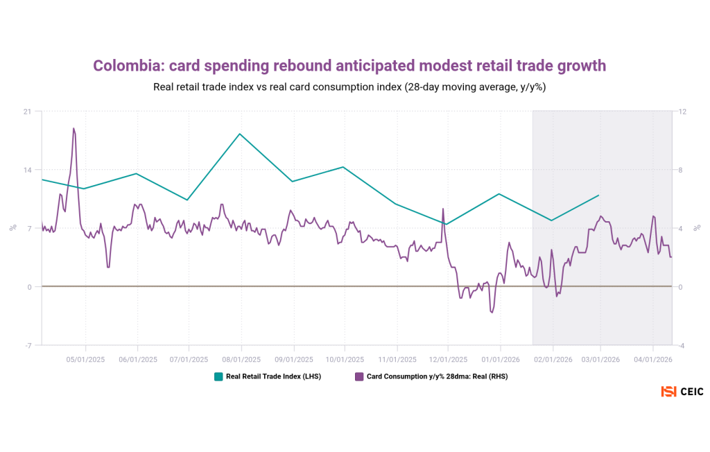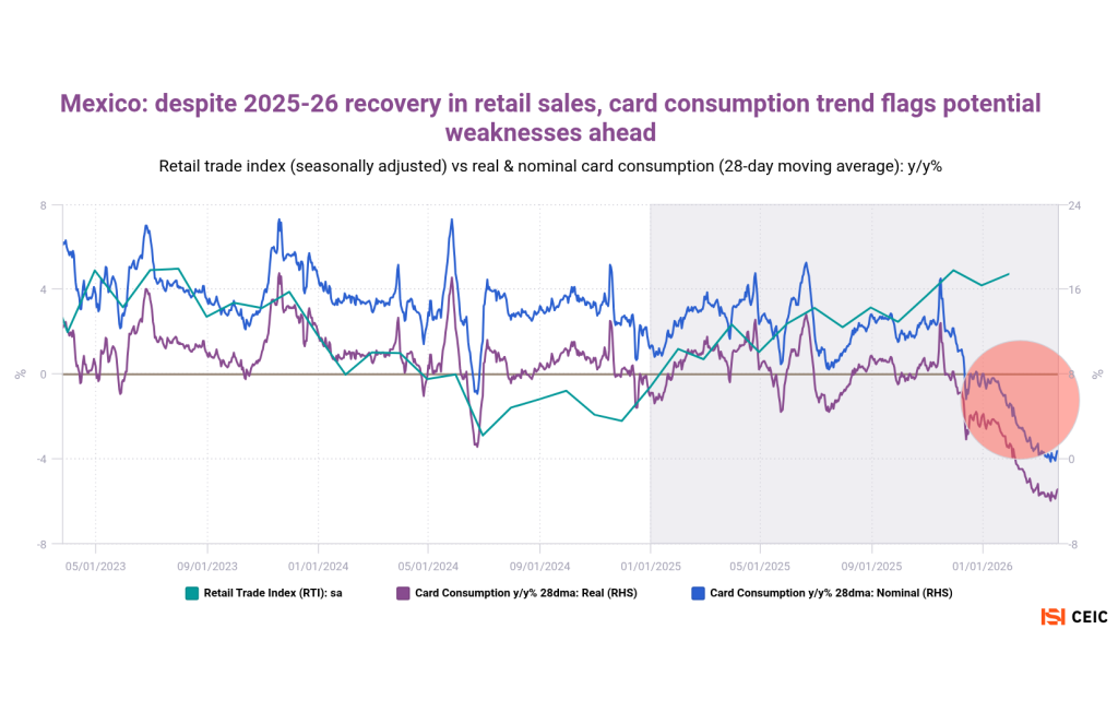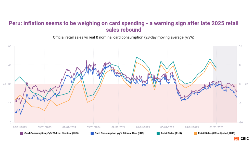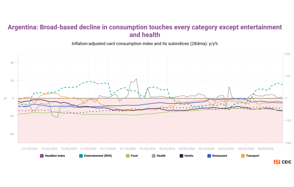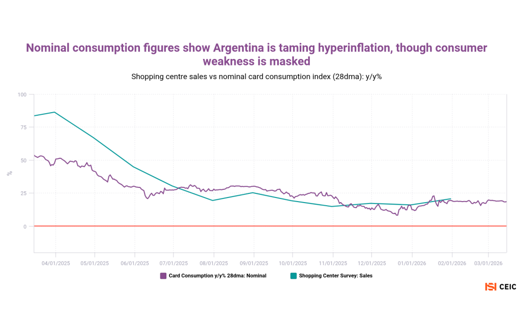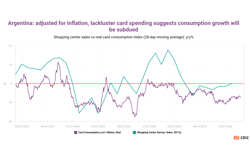 Home>News & Insights>Publications>Latin American daily card transactions suggest inflation is depressing consumer spendingLatin American daily card transactions suggest inflation is depressing consumer spending CEIC Publications Ian Lim 20.04.2026 1 min read Spanish banking giant Banco Bilbao Vizcaya Argentaria (BBVA) operates across Latin America, compiling daily credit-card spending metrics that give early insights into official retail sales figures. Reignited inflation seems to be weighing on consumers in several markets — even before the most recent global energy shock. Mexico’s official retail trade figures had shown gradual improvement over 2025 – especially since October. But card consumption patterns have taken a nosedive since December, especially in real terms. Peru had also seen an upturn in late 2025, but inflation ticked sharply higher last month – hit by the global increase in oil prices as well as a domestic gas crisis and low crop yields. Card transactions are slipping downward. We’ve added three charts on the special case of Argentina, where hyperinflation has been tamed by Javier Milei’s reforms. Price increases remain elevated on a global basis, however, making it key to highlight the inflation-adjusted figures (nominal card-spending growth is running at a 19% pace). We’ve also used a shopping center sales survey as our official metric. Argentine card transactions have seen a significant, continued deterioration since Q1 2025. With the exception of entertainment and healthcare, card spending has usually been declining for all categories since the middle of last year. Colombia is still demonstrating relatively strong consumption. While BBVA reported a brief December year-on-year downturn, this was likely attributable to high base effects from an unusually strong December 2024. Tags InflationLATAMRecent Posts Energy inventories: emerging Asia's vulnerability as Hormuz crisis persists CEIC 20.04.2026 Publications As rival US and Iranian blockades of the Strait of Hormuz continue to destabilize global energy flows, oil-importing nations are rolling out emergency conservation measures. For some Asian markets, a lack of oil and gas inventory is making the situation increasingly precarious. Read More Middle East war CEIC 20.04.2026 Publications The International Monetary Fund recently released its World Economic Outlook with a telling subtitle: Global Economy in the Shadow of War. Since March, the US-Israeli attack on Iran has disrupted commodity markets and reignited inflation expectations. Read More KKR-Led Consortium with Singtel to Take Control of STT GDC in USD 10.9bn Data Centre Deal EMIS 20.04.2026 Insights A consortium led by U.S. private equity heavyweight KKR, together with Singapore Telecommunications Ltd (Singtel), has agreed to acquire an Read More Sorry, no articles match the current filters. Sorry, no articles match the current search query.