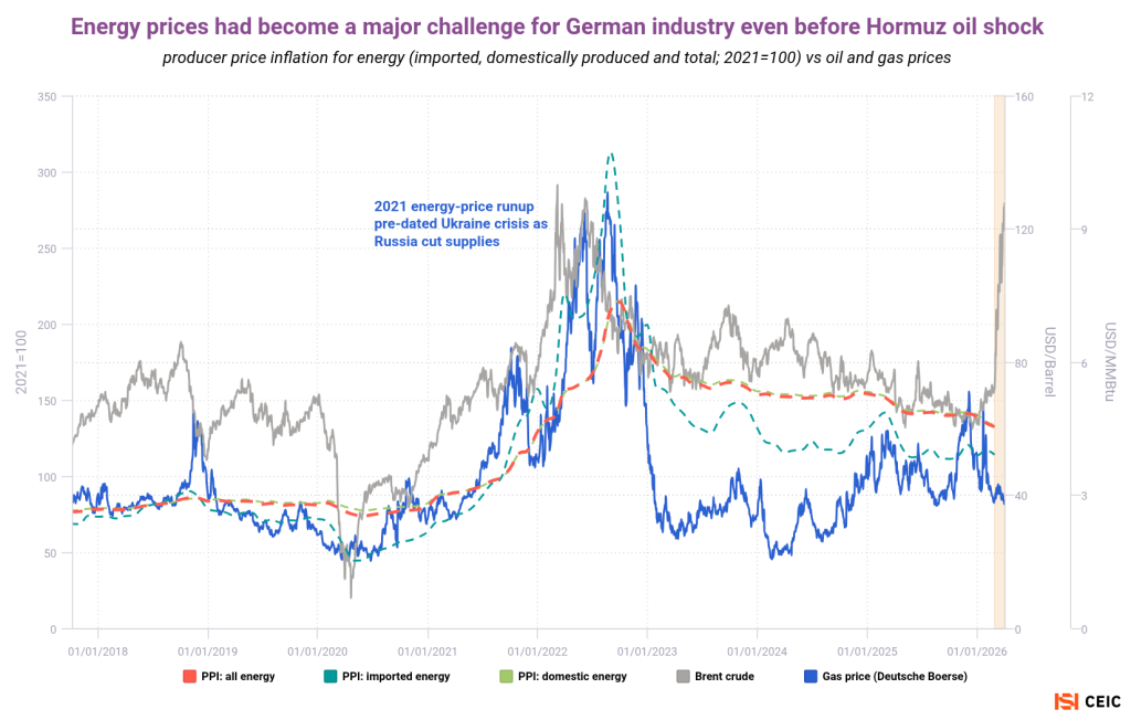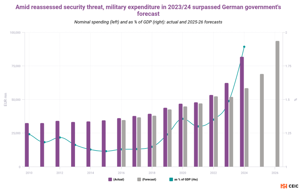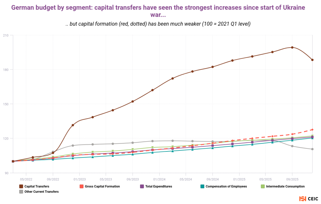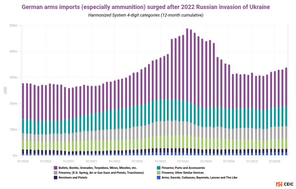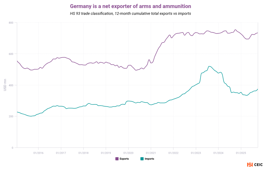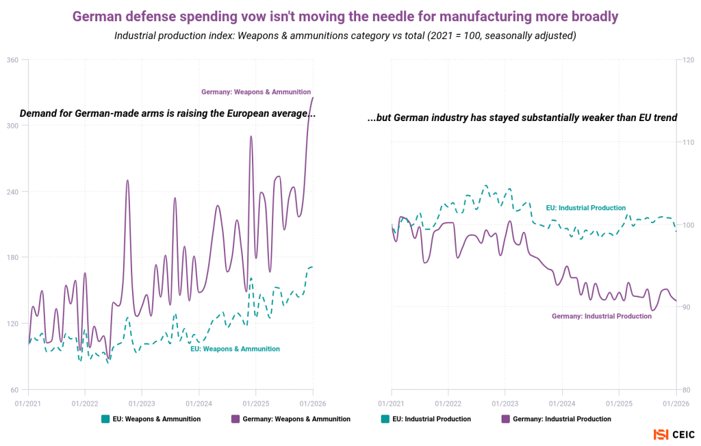 Home>News & Insights>Publications>Merz defense push hasn't revived German manufacturingMerz defense push hasn’t revived German manufacturing CEIC Publications CEIC 06.04.2026 2 min read By Ahmet Kaya When Chancellor Friedrich Merz announced a dramatic increase in defense spending a year ago, many observers hoped that this would stimulate Germany’s stagnant industrial production. National champions such as Rheinmetall — a major producer of artillery shells as well as tanks and air-defense systems — had already expanded production massively this decade, supplying both NATO partners and Ukraine in the wake of the Russian invasion. So far, Merz’s spending has had little wider effect. Unlike the beleaguered automotive sector, armament firms have limited supply-chain linkages to the broader German manufacturing base. As our first chart shows, the arms component of the German industrial production index (IPI) has outpaced its EU equivalent. But overall German IPI continues to underperform the European average — despite Germany’s firmly entrenched status as a net exporter of weaponry (as our second chart shows). The Ukraine war looms large in our subsequent charts, which delve into the international arms trade of the 2020s and the German budget. As Russia’s invasion fundamentally reshaped European security perceptions and Ukraine’s allies sent weaponry east, Germany replenished its stocks via imports in 2022-23 — led by US ammunition and missiles, as UN Comtrade figures show. US supplies are popular with allies due to speed of production and interoperability. Italy also figures strongly as Germany’s no. 2 supplier, demonstrating the nation’s role in niche capabilities such as helicopters and integrated European production benefiting firms such as Leonardo SpA, a Rheinmetall partner. Even before Merz’s defense plan (enabled by keeping this category exempt from the national “debt brake” rule that otherwise restricts German spending), budget figures reflect the post-2022 security reassessment. Germany increased its military spending as a share of GDP to 1.9% in 2024 from about 1.5% a year earlier. Finance ministry projections show a continued increase through this year. The outsized growth in the “capital transfers” segment, which includes military grants, is notable. By contrast, the “gross capital formation” segment, which would reflect the production of more military equipment or the construction of new bases, has grown much more slowly. With global geopolitical tensions rising and President Trump demanding NATO partners take on a role in the confict with Iran, policymakers will still be hoping that the defense demand boom spills over to more German factories. But our last chart demonstrates the nation’s lingering industrial challenge. Energy costs have remained high this decade, even before the Persian Gulf crisis sent oil prices soaring in March. Tags defenseEuropeManufacturingRecent Posts China-Mexico relationship reflects increasingly entwined manufacturing CEIC 06.04.2026 Publications As Mexico starts talks with Donald Trump's administration to review the USMCA trade agreement, economic ties with China are in focus. As China-Mexico bilateral flows have grown, the relationship increasingly touches on the most politically sensitive segments of North American manufacturing. Read More Bank of Japan's case to hike rates as union's wage wins combine with Iran oil shock CEIC 06.04.2026 Publications The imported supply shock from war in the Persian Gulf is dominating headlines, but Japan also has uniquely homegrown inflation pressures. Read More Daily payment card data from the world's fuel stations point to war-driven uptick in the CPI CEIC 06.04.2026 Publications From the first Gulf War in 1990 to the current crisis in the Strait of Hormuz, the quickest impacts from geopolitical shocks often show up in gasoline prices and then feed into inflation. We can observe this phenomenon in near real time thanks to our daily and weekly payment-card data for major economies. Read More Sorry, no articles match the current filters. Sorry, no articles match the current search query.