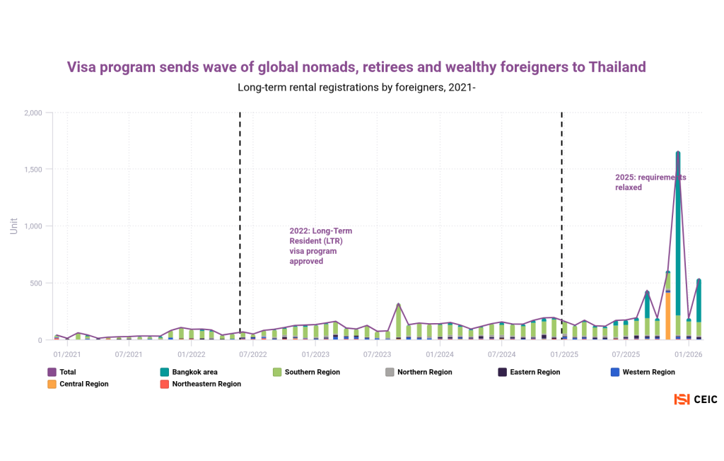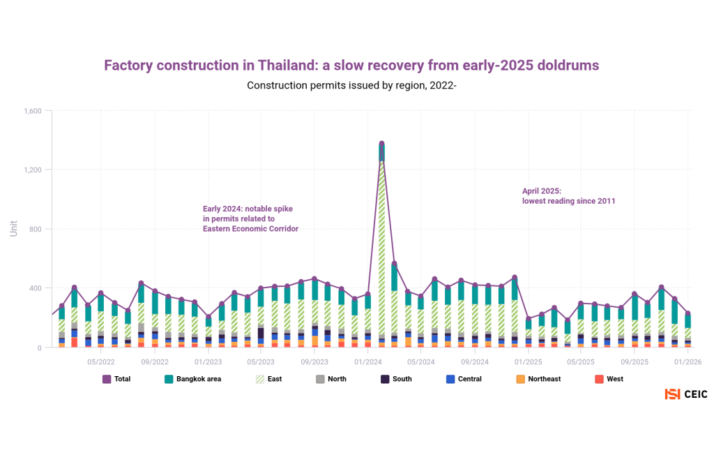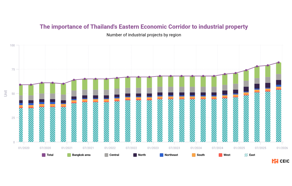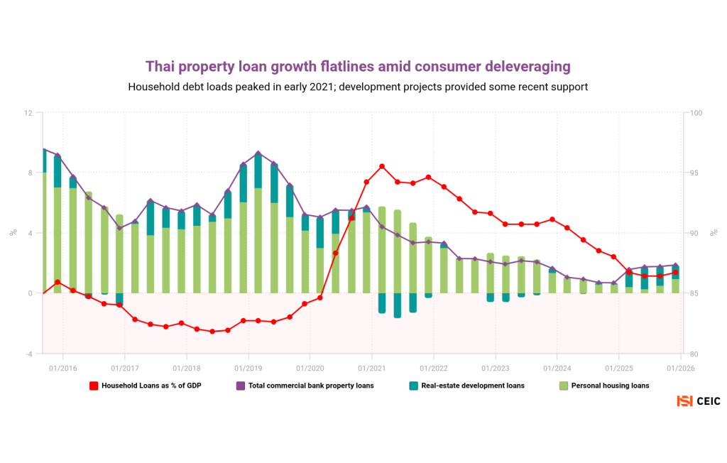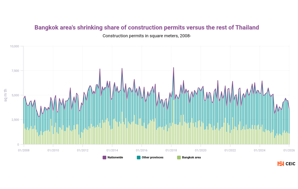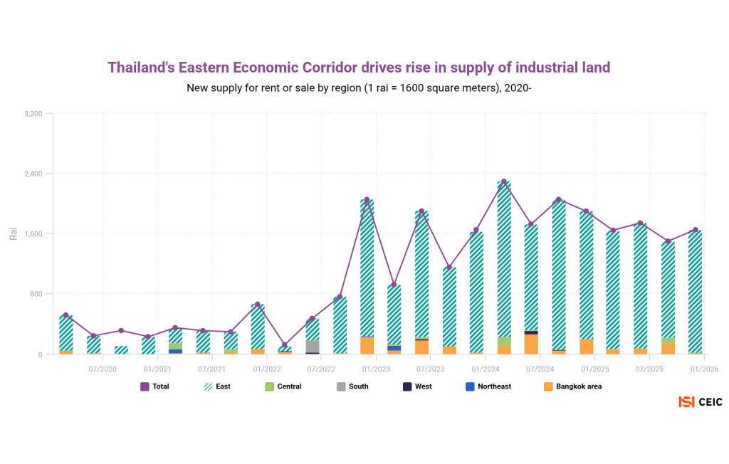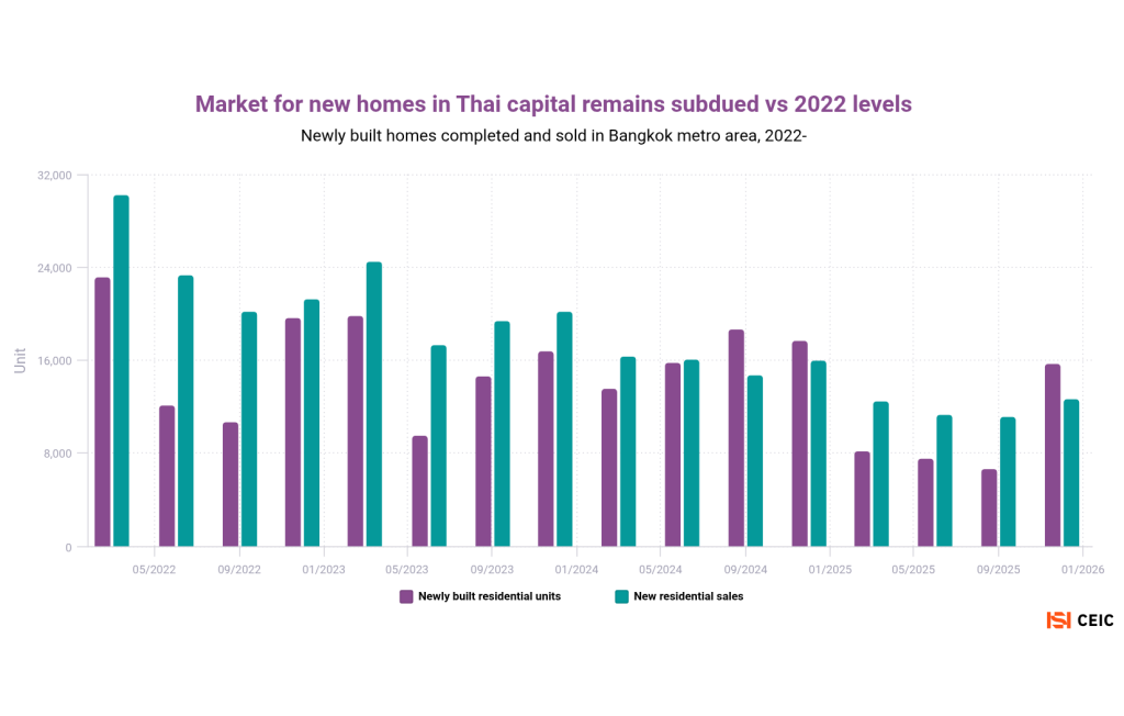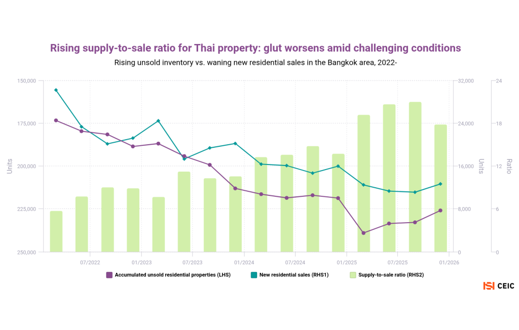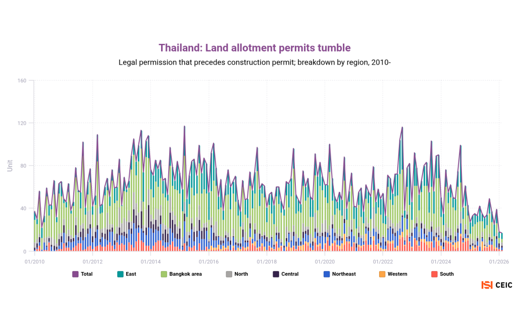 Home>News & Insights>Publications>Thai property glut lingers amid stretched consumers, limited industrial demandThai property glut lingers amid stretched consumers, limited industrial demand CEIC Publications Per Hung Yap 27.04.2026 1 min read Our ASEAN Premium database is unlocking more signals from one of the world’s most dynamic economic regions. A deep dive into our Thai datasets reveals a property market encumbered by oversupply: the inventory of unsold homes is rising in Bangkok, while factory construction is taking time to catch up to an ambitious industrial development in eastern Thailand. Consumer deleveraging is partly to blame. Thailand’s personal debt levels surpassed 95% of GDP during the pandemic; as consumers have whittled down that burden and sold assets, they aren’t taking out enough new mortgages to absorb the supply of residential property being built. An analysis of bank lending shows that private housing loans rose less than 1% in the most recent data; only a slightly healthier figure for property development is supporting real-estate loan growth. Land allotment permits – a legal move that developers must take before applying for construction permits in Thailand – have tumbled to the lowest in more than 16 years. An analysis of construction permits, meanwhile, shows particular weakness in Bangkok and its suburbs. On the industrial side, the Eastern Economic Corridor initiative has resulted in a flurry of activity. This development plan aims to spread economic and population growth east of Bangkok and is supported by Japanese foreign investment. The amount of industrial land available for development has surged, but actual factory construction has been less sustained. The Bangkok real-estate sector will be hoping for continued support from a new source of home buyers and renters: foreign retirees, “global nomads” and wealthy entrepreneurs. The government relaxed requirements for the Long-Term Resident (LTR) visa program in 2025, resulting in a surge of home rentals by foreigners – especially in the capital. Tags ASEANreal estateRecent Posts Europe Positions Itself for Growth in Chemical Plastic Recycling EMIS 28.04.2026 Insights The global plastic recycling services market is projected to grow to USD 24bn by 2030, according to figures from Grand Read More EMIS Expands Latin America Private Company Coverage EMIS 27.04.2026 Press Releases Bogota, April 28th – EMIS, leading provider of emerging market intelligence, announced a major expansion of its Latin America company Read More IHS Towers Exits Brazil in Near USD 1bn Sale to Macquarie EMIS 24.04.2026 Insights, Publications UK-based IHS Towers has agreed to sell its Latin American tower business, including its Brazilian operations, to Macquarie Asset Management Read More Sorry, no articles match the current filters. Sorry, no articles match the current search query.