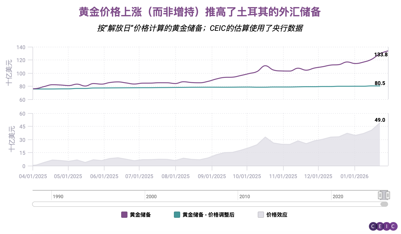 根据CEIC的计算,拆分黄金价格上涨与央行增持黄金的双重影响后可见:自2025年4月以来,黄金牛市已为土耳其央行储备贡献约490亿美元增长。(当时特朗普的 “解放日” 关税政策重创全球市场,加剧了市场对美元贬值的担忧,黄金的避险需求也随之再度升温。