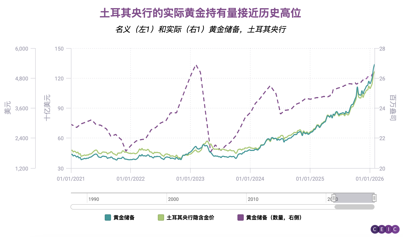 下组图表显示,土耳其央行的黄金储备不仅名义规模实现增长,实际价值也同步走高,且目前仍维持在历史高位附近。