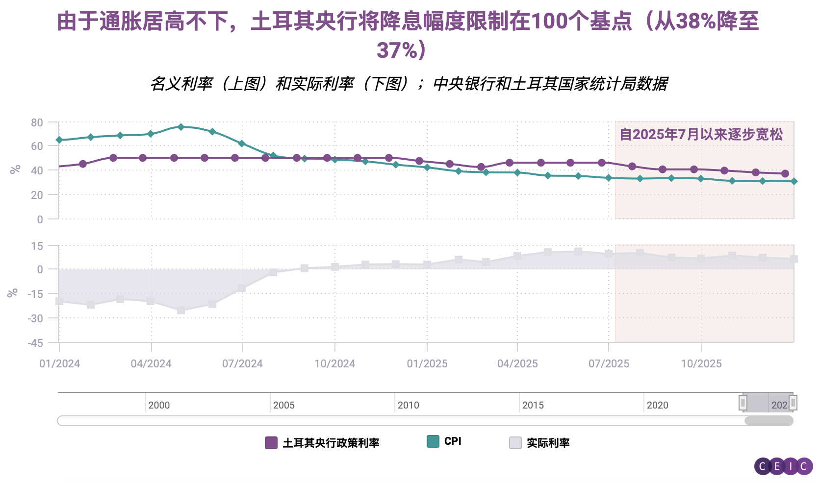 货币政策方面,土耳其央行近期延续宽松周期,但降息幅度小于部分观察人士的预期。由于通胀仍顽固维持在30%左右,央行的行动始终保持谨慎。