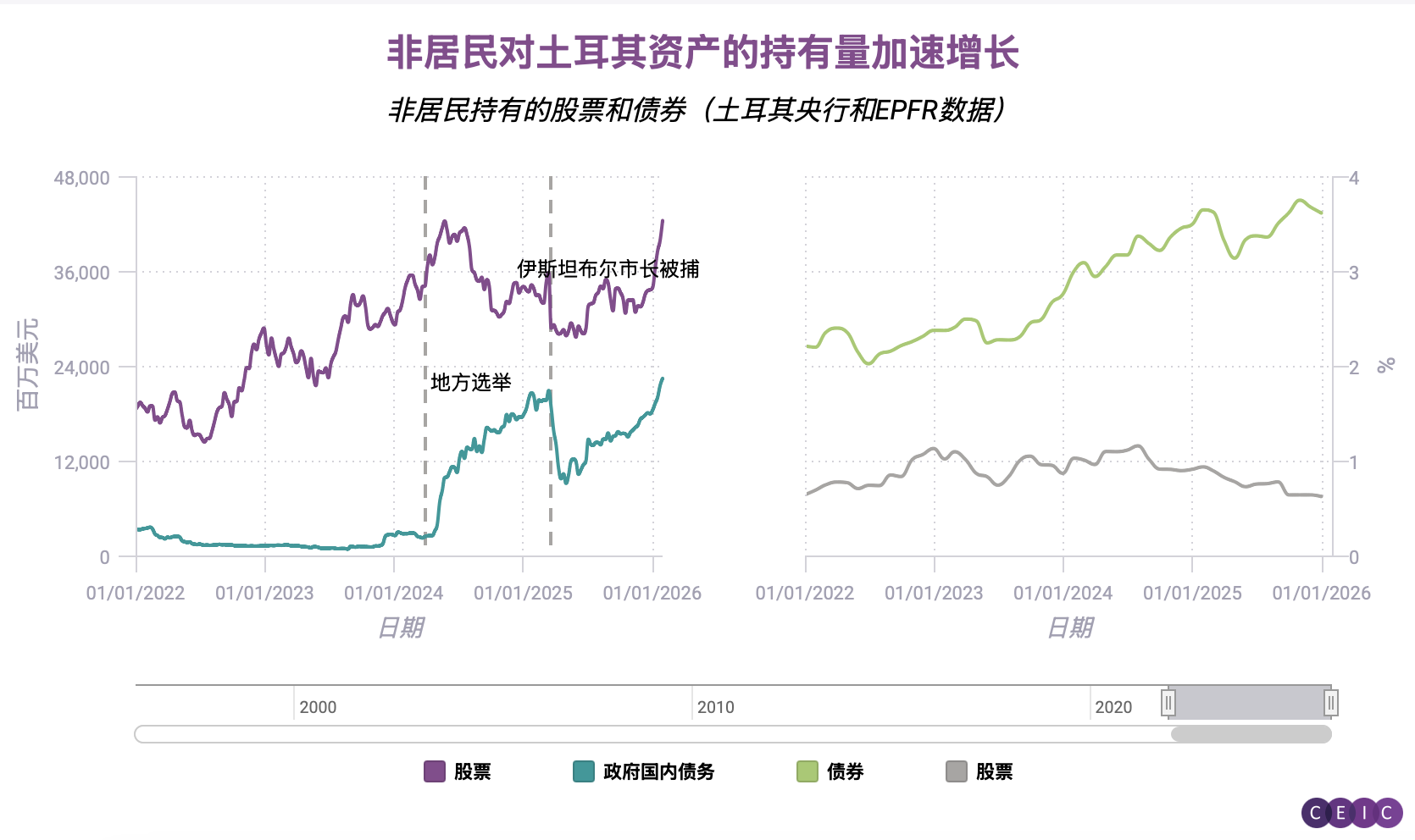 今年以来,约有62亿美元的外国净资金流入土耳其股市,36亿美元流入国内政府债券。这两股资金流推动外资持有土耳其资产的总额创下约 614 亿美元的历史新高——尽管土耳其在全球新兴市场指数基准中的权重占比一直较低且变动不大。(EPFR数据显示,土耳其在新兴市场债券指数中的权重为 3.6%,在新兴市场股票指数中的权重仅为 0.6%。)