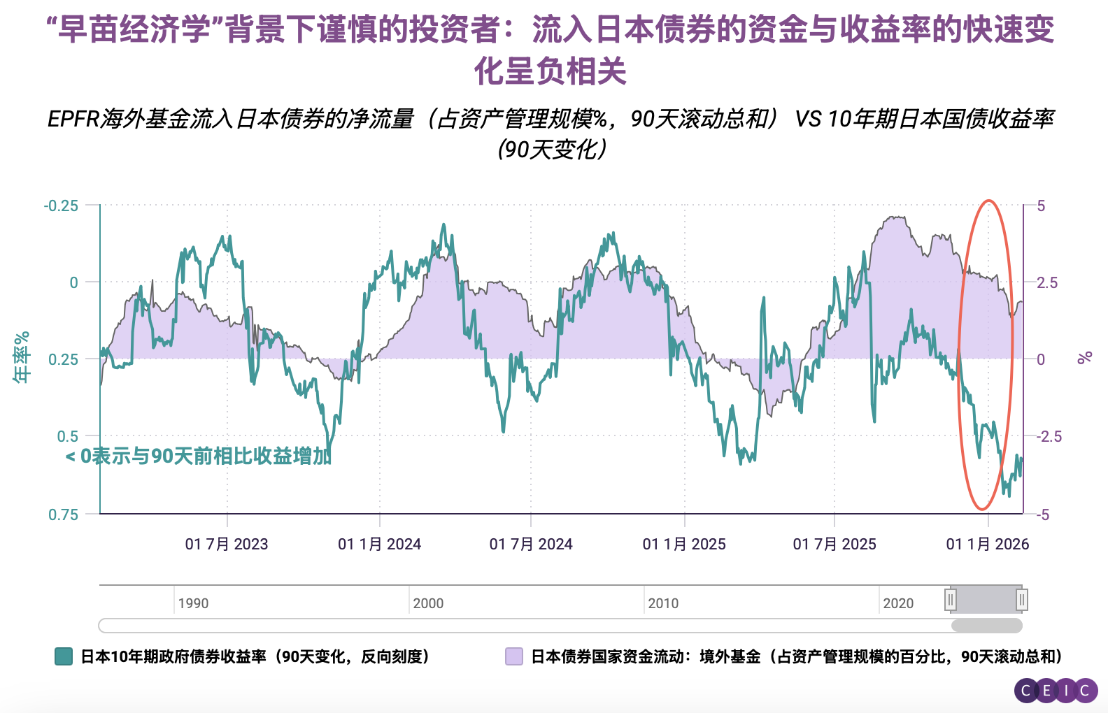 外国投资者作何反应?我们可以通过EPFR的独家资金流向数据洞察端倪。如以下图表所示,日本国债收益率的快速大幅变动(按 90 天滚动周期测算),即便推高了债券票面利息,仍对海外资金流入日本债券基金形成了显著抑制效应。当前资金流入规模已远低于去年9月的近期峰值。