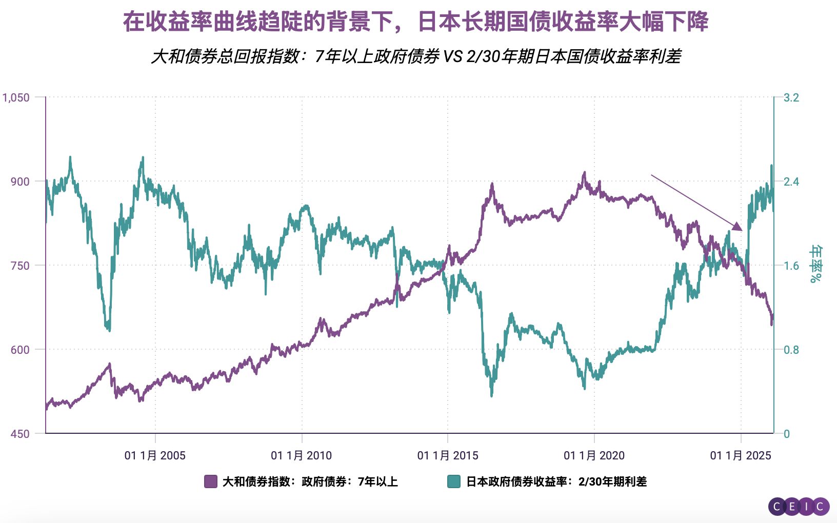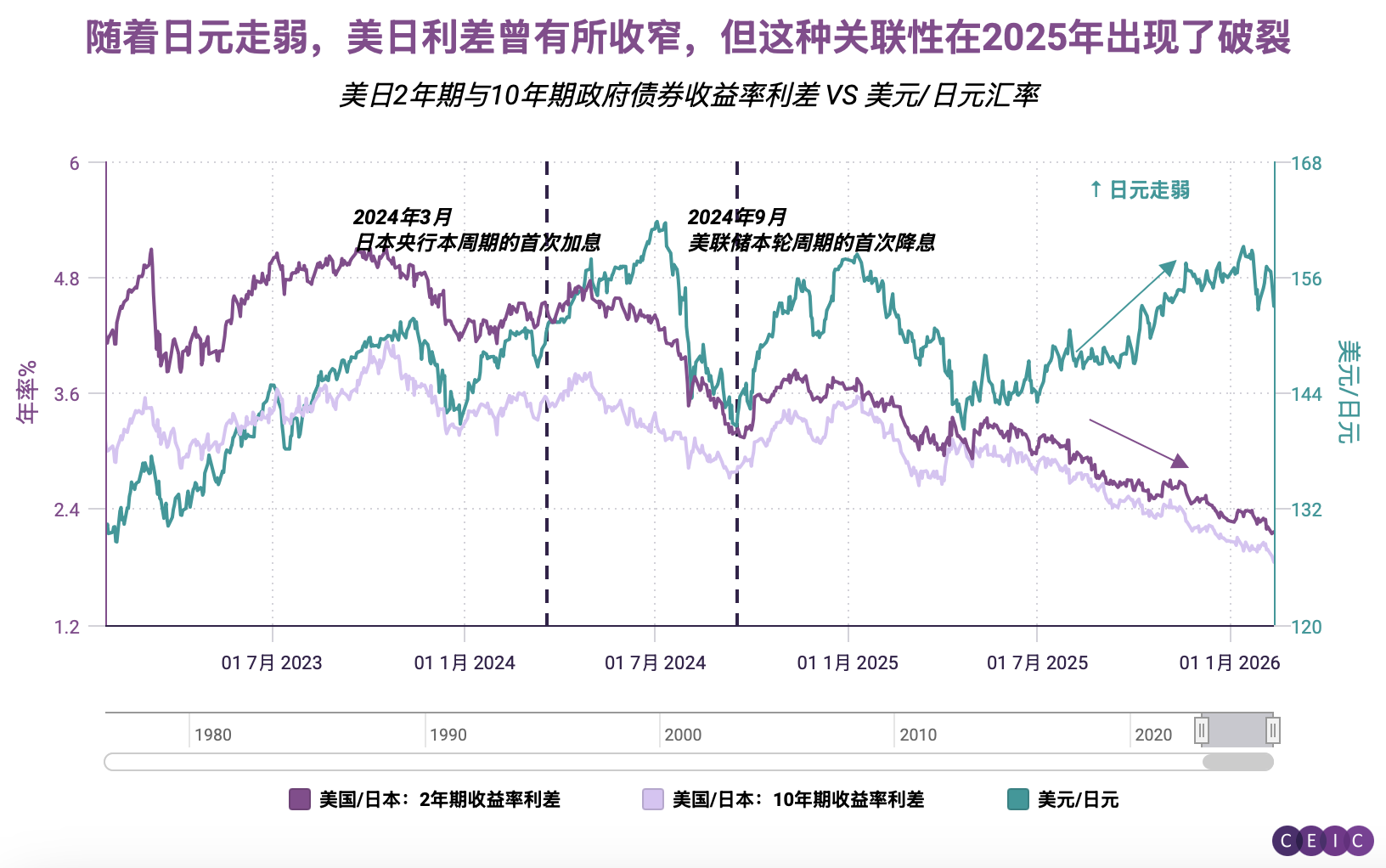 下组图表显示,随着收益率曲线趋陡,长期国债回报率显著下滑。与此同时,政府支出计划亦对日元形成压制。第二张图表显示,尽管美日利差持续收窄,日元兑美元汇率仍不断走弱。这标志着日元汇率与利差的历史关联已被打破,也意味着市场开始计入日本的财政风险溢价。