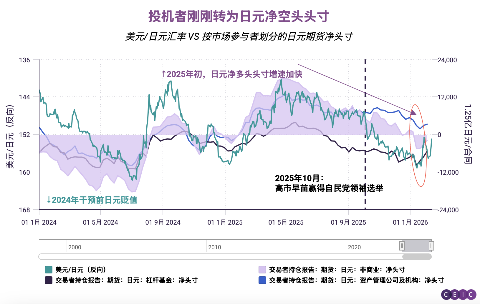 另一方面,美国商品期货交易委员会(CFTC)数据显示,自四月下旬以来,杠杆基金等投机机构持续削减日元净多头头寸,近期更转为净空头状态。随着日元逼近160关口,市场正警惕日本财务省出台类似2024年年中的汇市干预措施。
