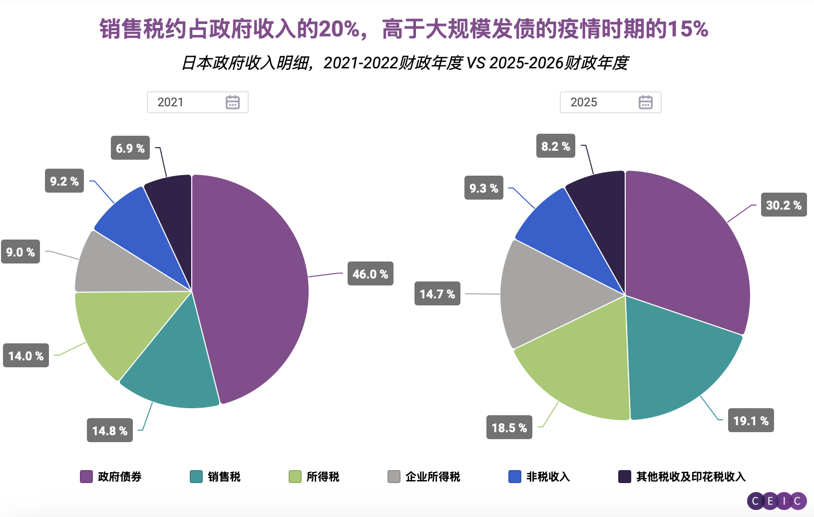 高市的民粹主义措施包括实施为期两年的食品消费税豁免(现行税率为8%),以应对引发日本居高不下且引发生活成本危机的食品通胀。以下的一组饼状图解析了该政策扰动债市的原因:当前政府财政对消费税收入的依赖度已远高于数年前。