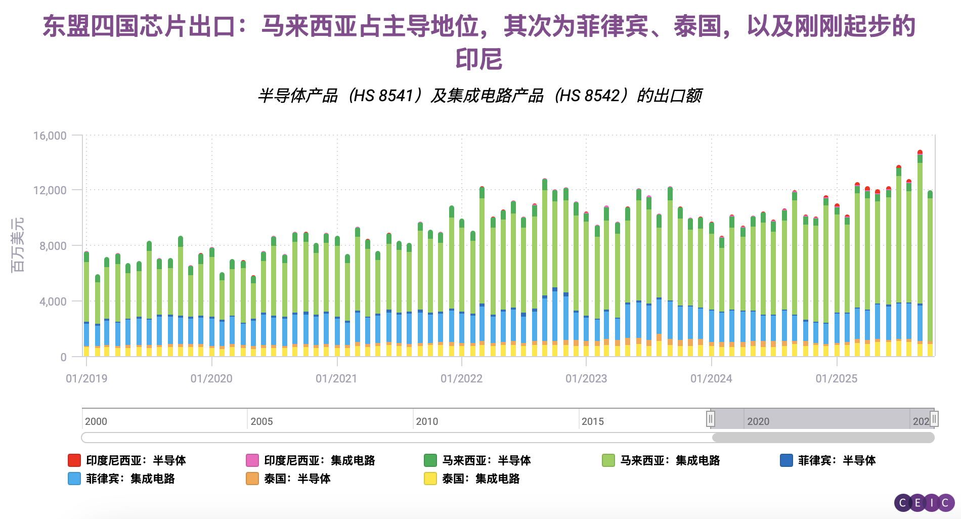 马来西亚尤以槟城半导体产业集群闻名,目前稳居东盟地区该行业出口榜首,菲律宾与泰国紧随其后。