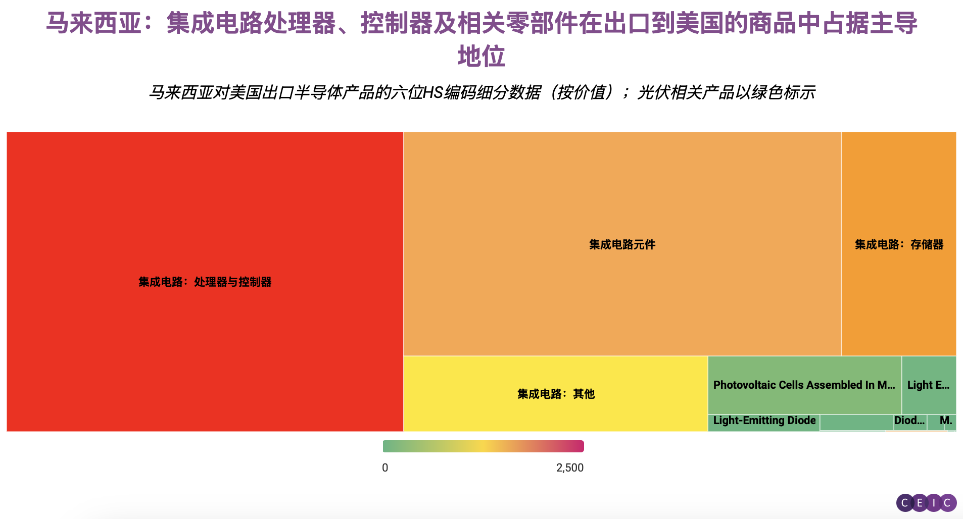 下图运用协调制度(HS)国际海关编码数据集对该产业进行分析,整合了HS 8541(包含二极管、晶体管、光伏组件等半导体器件)与HS 8542(集成电路板)两类商品数据。