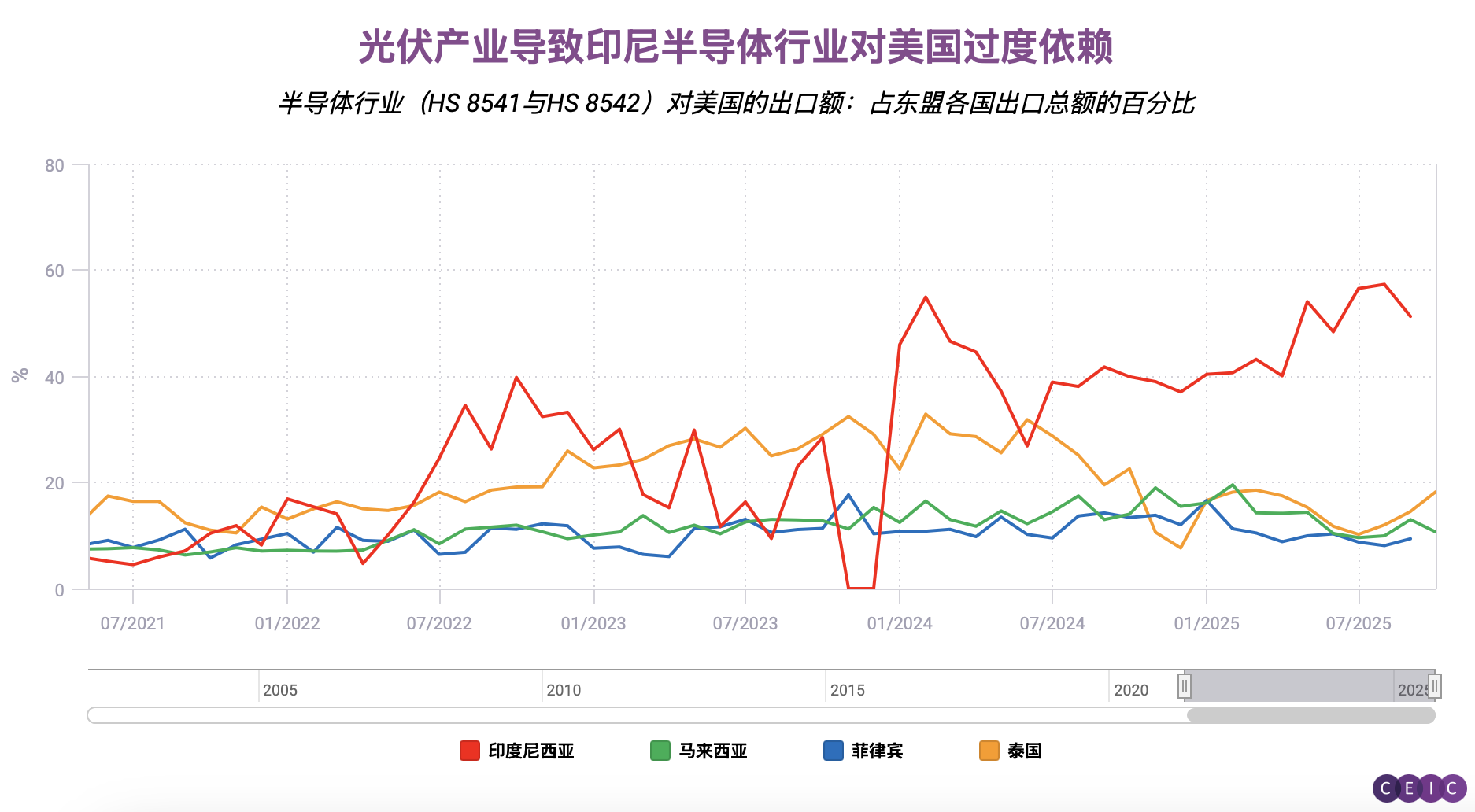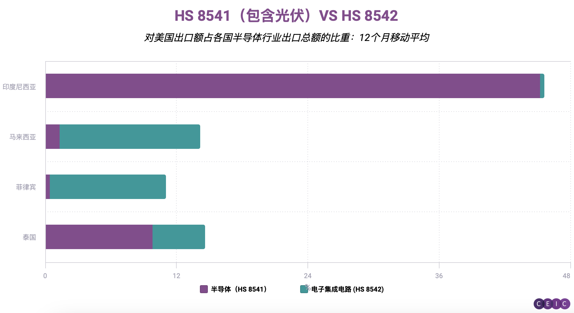 贸易依赖度图表显示,印尼相对新兴的半导体产业对美国市场依赖度最高:超过50%的产品出口至美国。(鉴于特朗普关税具体范围未明,HS编码的复杂性表明,太阳能等看似不相关的产业也可能卷入这场“技术驱动型”半导体争端。)相比之下,规模更大的马来西亚芯片产业对美市场依存度仅为14%。