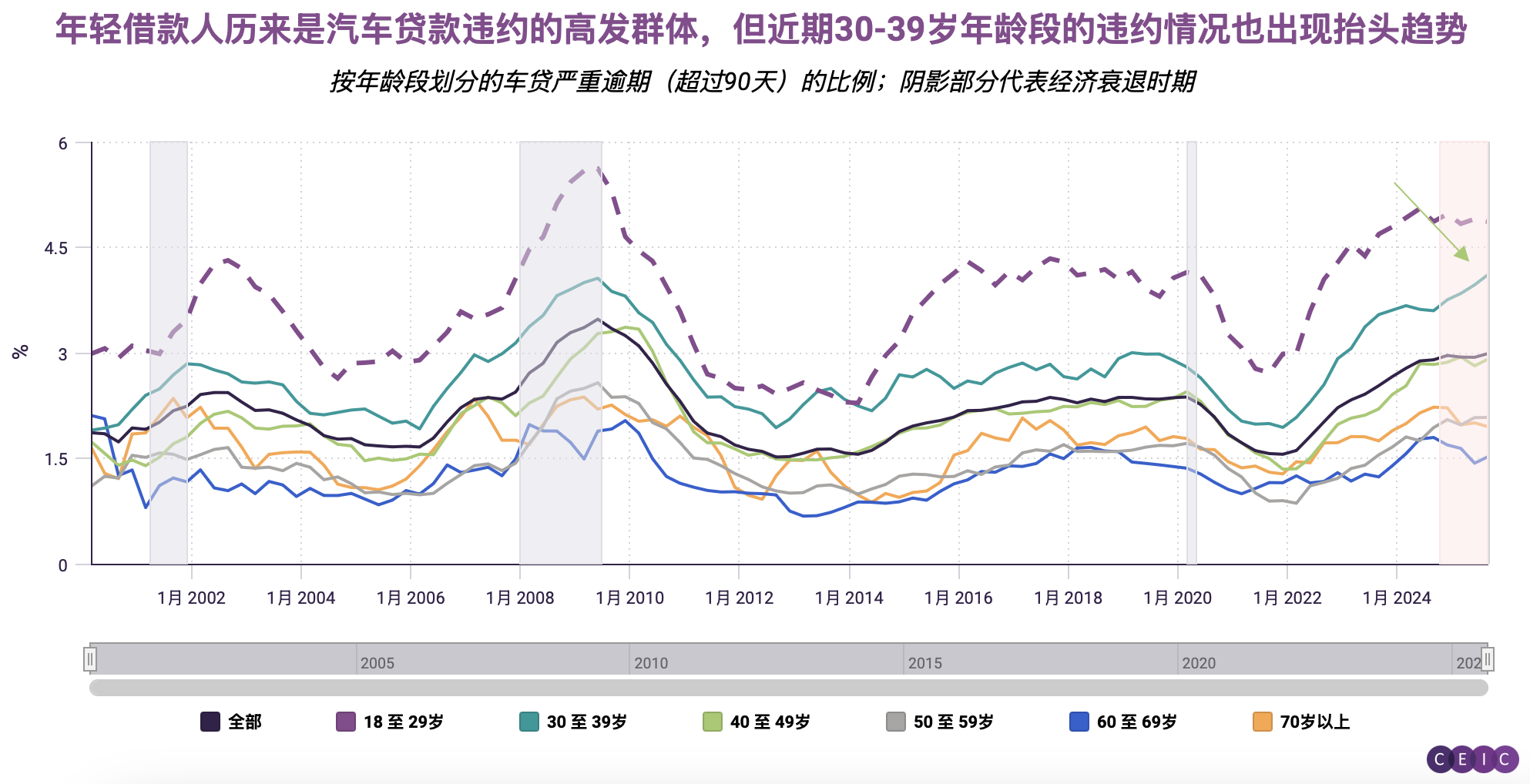 按年龄分层数据显示,最年轻的驾驶群体在偿还车贷方面最为困难——这一现象符合常态。近两年来,18-29岁年龄组中约有5%的汽车贷款被列为“严重违约”,即三个月或更长时间未还款。值得注意的是,这一水平仍低于全球金融危机时5.6%的峰值。或许更令人担忧的是,202530-39岁这一黄金工作年龄段群体的还贷状况正持续恶化。