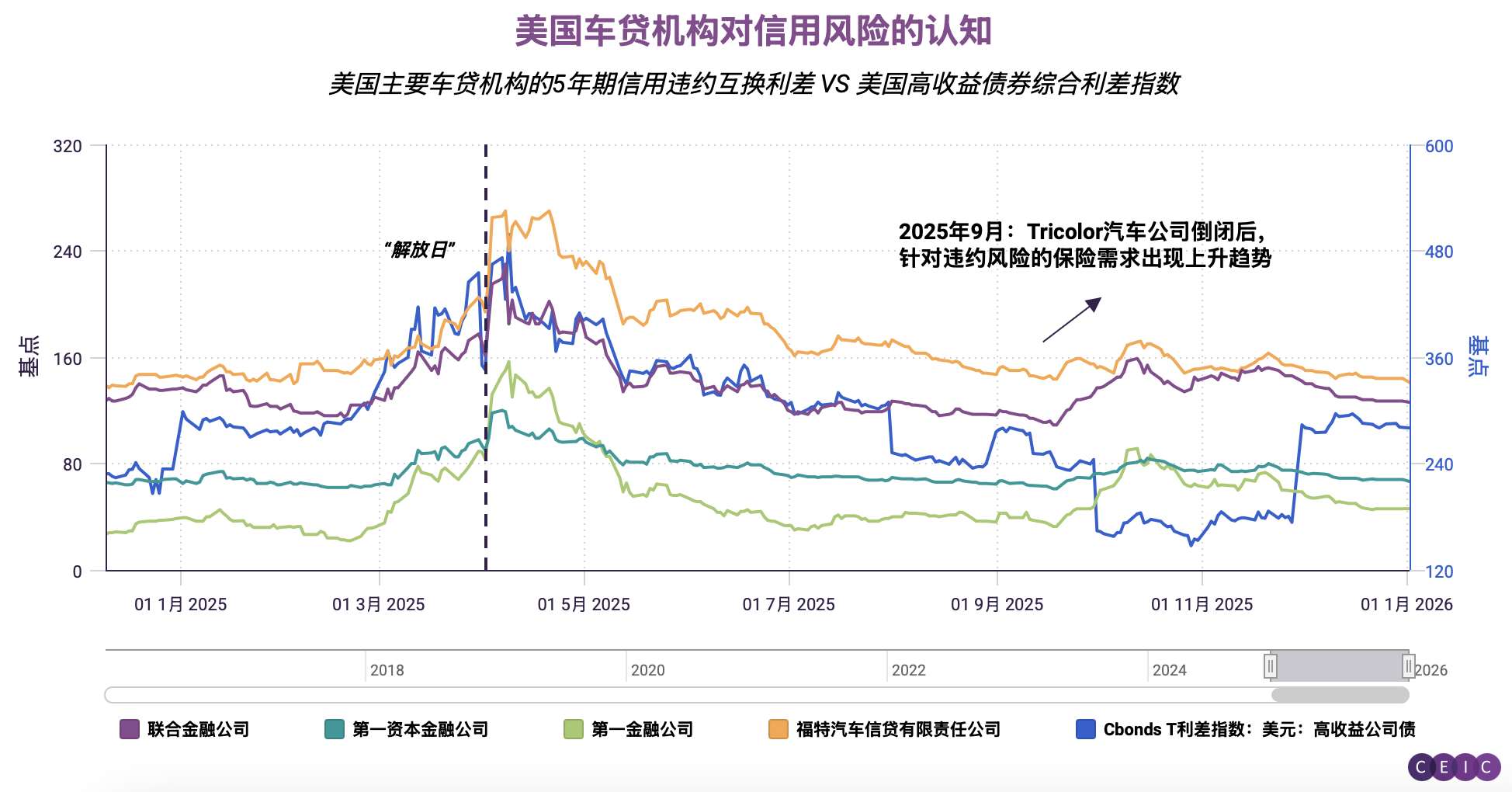 最后一张图表展示了美国主要汽车贷款机构(如联合汽车金融公司和第一资本金融公司)的预期信用风险(通过信用违约互换价格衡量)。Tricolor破产后,主要车贷机构曾出现风险上行波动,但此后已逐渐回落。