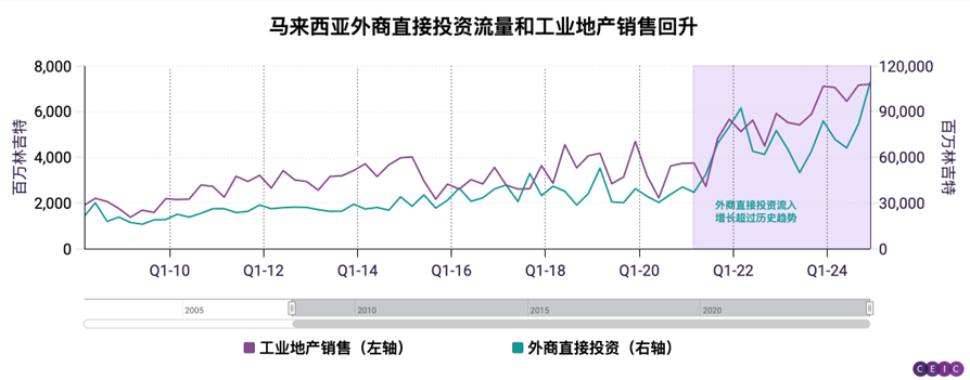 马来西亚房地产市场活跃,出现外商直接投资热潮。其中特别引人关注的是工业地产交易额正在激增,与2021年中期以来FDI流入高于长期趋势的表现相一致。