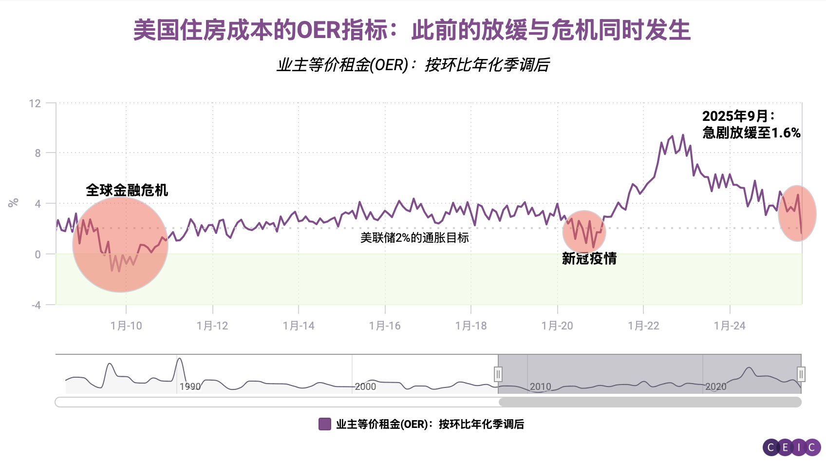 以下图表绘制了过去二十年的OER走势图。9月,OER的年化环比增速从8月的4.7%急剧放缓至1.6%。近几十年来类似程度的放缓仅出现在全球金融危机和新冠疫情期间。