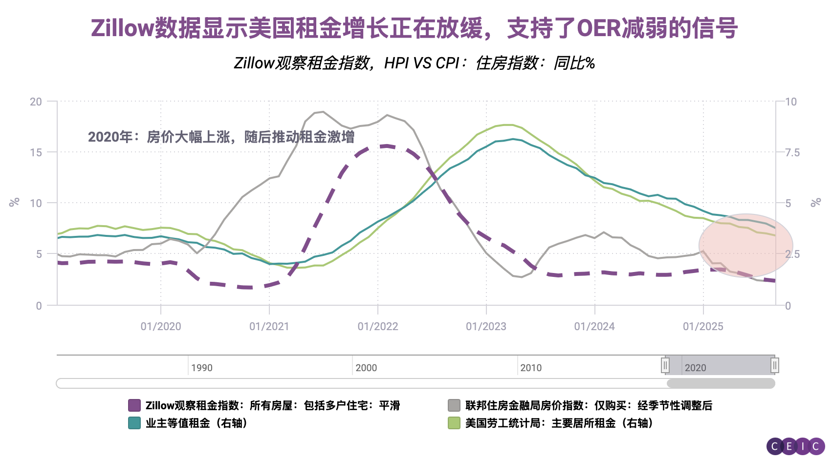 这种急剧放缓意味着什么?在整体通胀仍具粘性的背景下(9月3%的CPI涨幅仍是1月以来最高水平),这只是一个异常值,还是为进一步降息提供了依据?为深入分析,我们将OER与美国知名房地产网站Zillow提供的另类住房数据进行了对比。