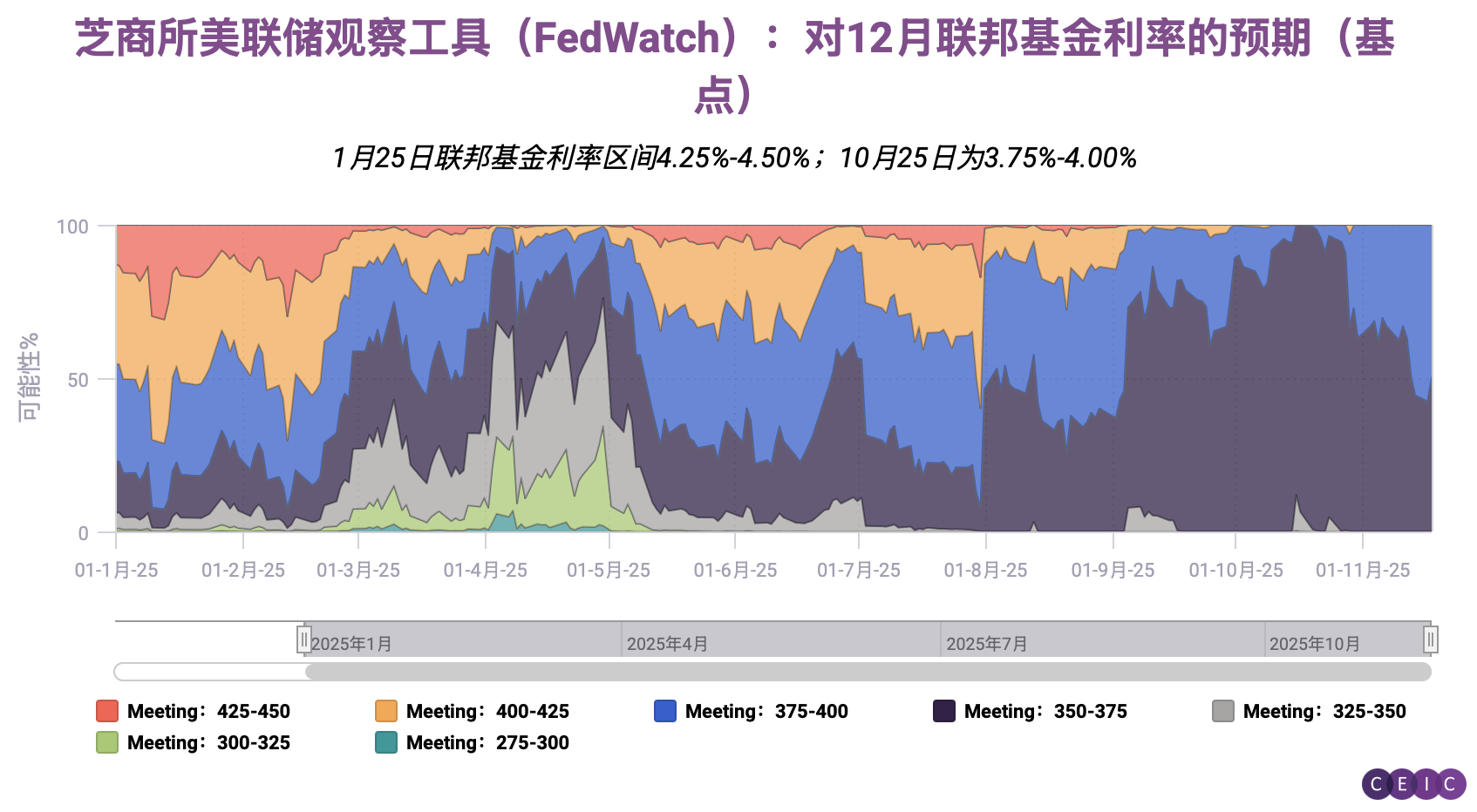 最后一张图表我们注意到,尽管如此,9月3%的通胀数据仍抑制了降息预期。在10月24日数据公布后数日,CME的FedWatch工具显示,市场对美联储在12月FOMC会议后将关键利率维持在3.75%-4.00%的概率略有上升。美联储10月29日降息后,主席鲍威尔相对鹰派的表态强化了这一预期——期货市场最近定价显示,美联储维持利率不变的概率已达38%。